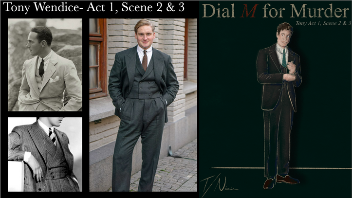 Jeffrey Hatcher's adaptation for the classic suspense thriller, Dial M for Murder sheds a new light on sapphic relationships in the 1950's and the deception, lies and suspicion that surrounds the affair of Margot and Maxine. Working with a limited color palette, I wanted to explore textures and silhouettes that are reminiscent of a foggy October night. Using the contrast of Margot's curves against the sharp angles of Maxine I wanted to pay homage to the different ways the two women interpret femininity, as well as break from lesbian stereotypes of what a business-minded woman looks like. It also speaks to the treatment of gay people at the time and the need to be discreet as to not loose jobs, money and status.