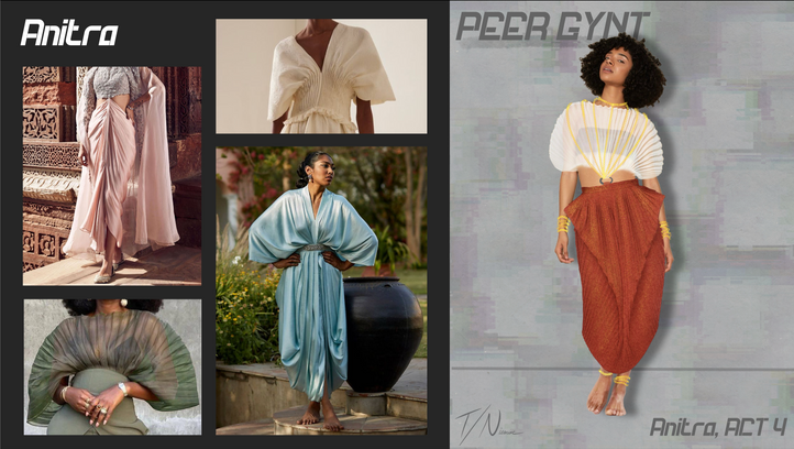 For this production, I imagined Peer Gynt as a deeply insecure person who has an inherent need for validation and attention. At the start of the play, Peer is a young man who seeks admiration from his mother but as he is introduced to a technological, fantasy world he transforms into an influencer- an embodiment of the need to constantly be viewed and seen, while sometimes having these moments of clarity where he realizes the superficial fantasy he is engaging with and his illusion is briefly shattered. Exploring how modern clothing moves from naturalistic to the fantastical future, my design was influenced by online trends, brand logos and sponsorships as well as heightened silhouettes that still remain recognizable.